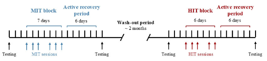 Der MIT-Block umfasste sechs Trainingseinheiten über sieben Tage und bestand aus langen Intervallen im moderaten Intensitätsbereich (RPE 14–15). Die Intervalle wurden als 7 × 10min (2,5min Pause), 6 × 12min (3min Pause) oder 5 × 14min (3,5min Pause) durchgeführt. Der HIT-Block bestand aus fünf Trainingseinheiten über sechs Tage, wobei jede Einheit aus 5 × 8,75min hochintensiver Belastung (RPE 16–18) bestand. Diese Intervalle waren in kurze 30s/15s-Intervalle unterteilt. Das gesamte Intervallvolumen war im MIT-Block mit 7h 4min deutlich höher als im HIT-Block mit 3h 42min. Die Trainingsbelastung wurde anhand von Herzfrequenzzonen quantifiziert.